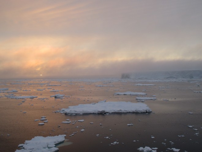 Petit à petit, la brume se dissipe et le soleil devient rougeoyant. Un décor surréaliste s’installe. Magnifique. Des morceaux de glace s’étalent jusqu’à l’horizon, lui-même entrecoupé çà et là d’immenses icebergs. Un astre mêlant d’étranges nuances de rouge, orange et doré colore l’eau par endroits. La partie immergée des blocs de glace est d’un bleu clair, lumineux. Les teintes sont telles que le paysage semble avoir été retouché par un graphiste. De temps à autre, un manchot dressé sur une plaque de glace à la dérive vient ajouter au charme de la scène. L’air est clair, maintenant, et le décor s’étale à perte de vue tout autour de nous.