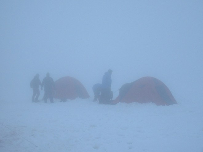 Après cette semaine chargée, nous partons sur un glacier du massif du Mont Blanc. Nous y plantons des tentes – dans un vent froid et un brouillard qui donne à la scène un aspect dramatique – pour cinq jours. Nous creusons un puits et posons par-dessus un tipi sans fond, où pendent deux lanières terminées par des boucles ; les bras passés dedans, nous utiliserons ces toilettes en suspension. Nous dressons ensuite des murs de glace devant les tentes pour les protéger du vent. L’objectif de cette semaine semble surtout être de nous observer en groupe, dans des conditions relativement inconfortables, dans le froid et en altitude. Le programme est plutôt léger, composé seulement de la vie de camp (préparation de repas, etc.), de courtes randonnées en crampons, une démonstration de sauvetage en crevasse, et un tour en hélicoptère qui conclut notre formation à la sécurité dans ces véhicules. Ce repos est bienvenu, dans mes derniers mois de doctorat.